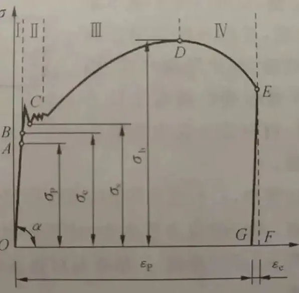 The curve in the figure can be divided into four stages: I. elastic deformation stage;